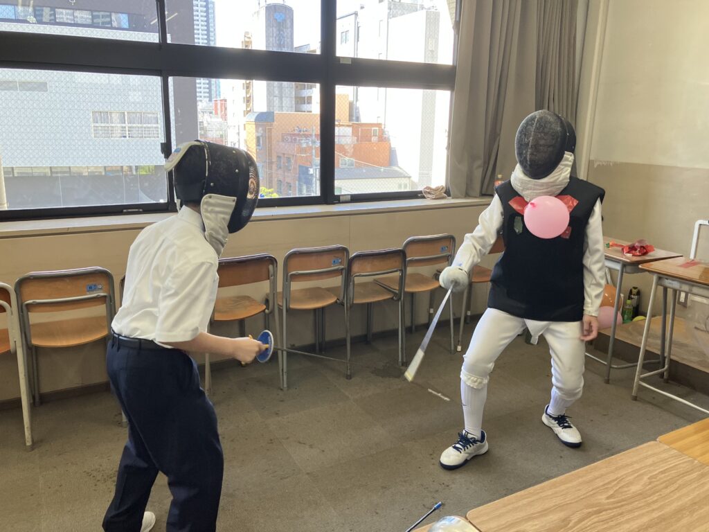 今年は部員の胸の風船を1分以内に割るゲームをしました。興味を持っていただいた方にはフェンシングの説明もさせてもらいました。高校生はもちろん、中学生も運営に一生懸命協力してくれました。
