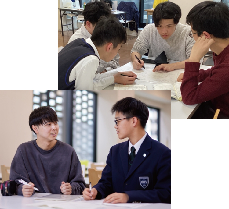 日曜・祝日、長期休暇期間など、登校日以外の日に、本校卒業生の難関大学在学生が在校生の学習をサポートする休日勉強会を実施しています。「復習して分からないところがでてきた」「問題集を解いていて行き詰ってしまった」など学習に対する様々な疑問・質問に卒業生がサポートします。卒業生自身が在学中に利用してきた休日勉強会、大学生になった今、在校生の学習を親身になって支援していくシステムです。