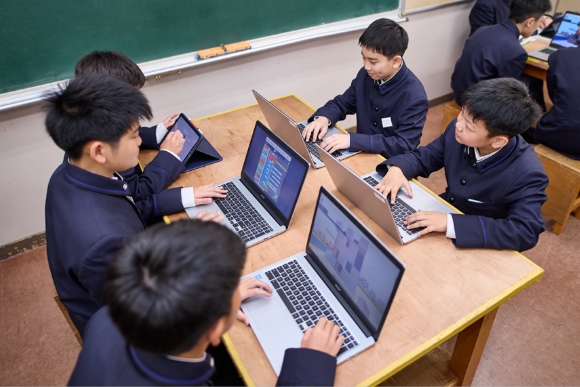 生徒達が大学生、社会人と歩みを進めて行く中でITスキルをより高めていくことは、より加速していく情報化社会の中では非常に重要なことと考えています。情報システムに精通していくための学びとして、プログラミングの実践を授業に取り入れています。マインクラフトに触れることからスタートし、高等学校ではJavaScript他、デジタル人材を輩出する基礎教育を構築しています。